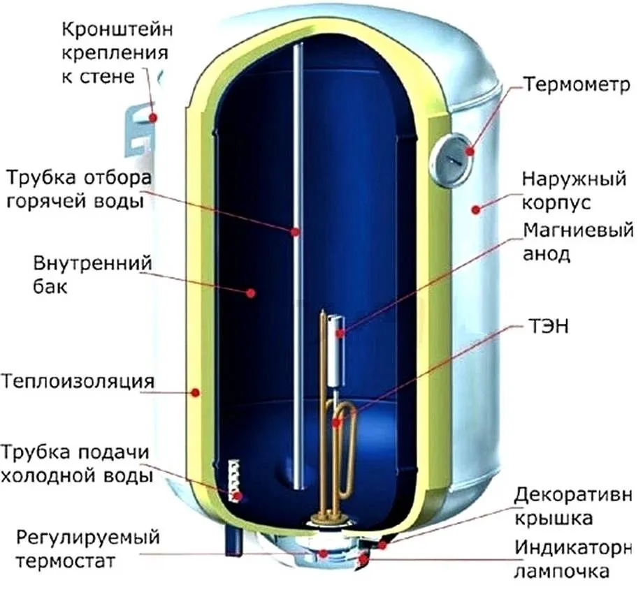 - В конструкции накопительных моделей предусмотрен большой резервуар для воды в котором расположен трубчатый нагревательный элемент (ТЭН). Внутрь этого бака поступает вода, нагревается до определённой температуры и хранится там. Постоянство температуры воды внутри резервуара контролируется термодатчиком, который соединён с термостатом. Для уменьшения теплопотерь корпус резервуара покрывается утеплителем.