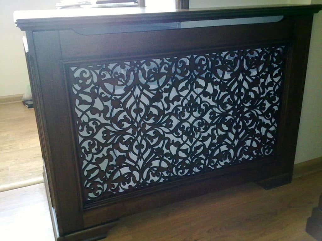 Следующий этап – самый трудоемкий. Нам нужна передняя решетка для радиатора из МДФ множеством отверстий для воздуха. Чем их будет больше, тем лучше, за вами – придание вырезам красивой формы. Тут придется изрядно потрудиться электрическим лобзиком и прочим инструментом, чтобы вырезать узор. Его рисунок и расположение зависит только от вашей фантазии и готовности затратить свое время. Рекомендация одна: не делать глухой верхнюю часть лицевой панели, чтобы нагретый воздух не стоял под крышкой короба.