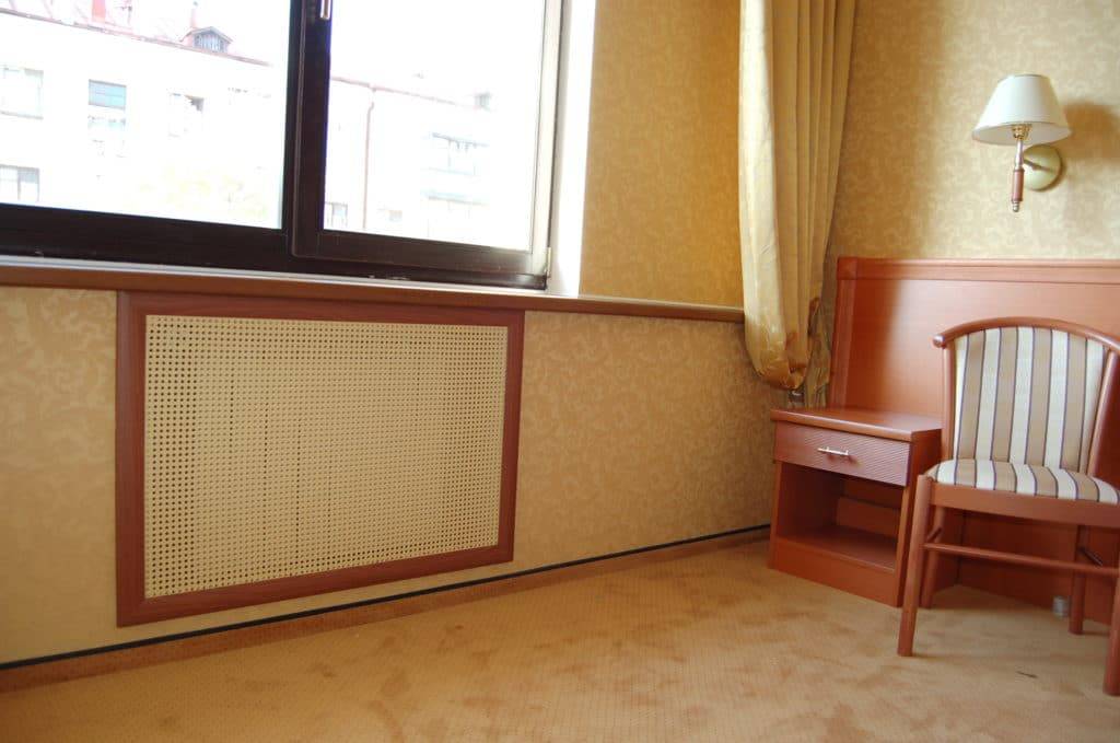 Решетки имеют разную форму, цвет и размер ячеек. Для экостиля подходит только этот материал, поскольку иначе батареи в комнате будут выделяться. При самостоятельном изготовлении или покупки защиты для радиатора, стоит учитывать, что дерево склонно к пересыханию, но эта проблема решаема: