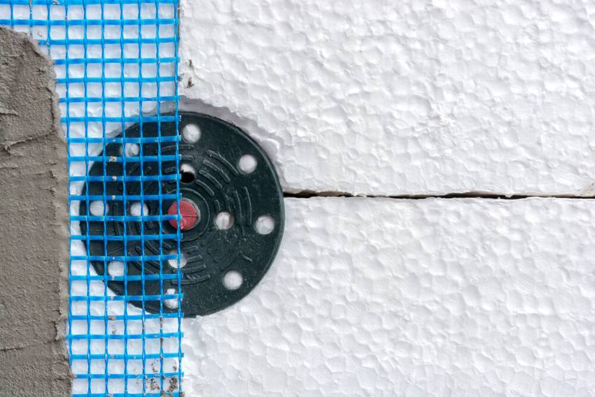 Дюбель забивается заподлицо с поверхностью плиты пенополистирола. Количество крепежных элементов зависит от высоты здания и предполагаемых ветровых нагрузок. Обычно достаточно 6-8 шт. на каждую плиту.
