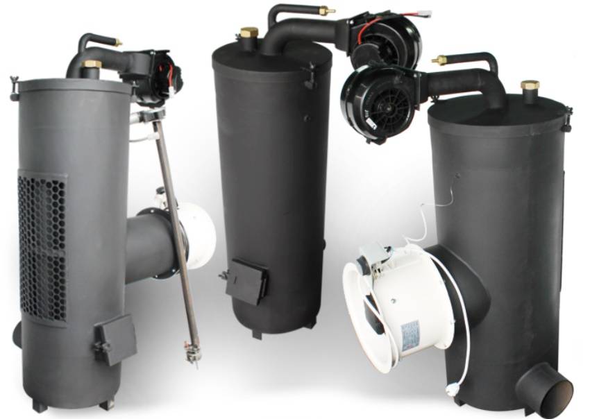 Горение осуществляется во внутреннем объёме печи, ограниченном металлическим цилиндром. Это наша камера сгорания – сверху в неё поступает воздух, в верхней боковой части располагается отвод под дымоход. На представленном чертеже изображён агрегат с поддувом, что делает его работу более эффективной. Водяной рубашки здесь нет, но есть вентилятор обдува, который обдувает воздухом внутренний цилиндр с камерой сгорания. Горячий воздух можно отправить через воздуховоды в обогреваемые помещения.