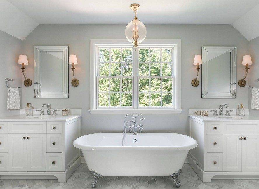 Очевидно, что ванная комната вместе с окнами выглядит выигрышнее, чем аналог с одними светильниками. Ведь дневной свет мощнее последних, а сами окна можно и нужно дополнить занавесами и подоконником. Однако от светильников не стоит отказываться. Тем более что они бывают разных видов.