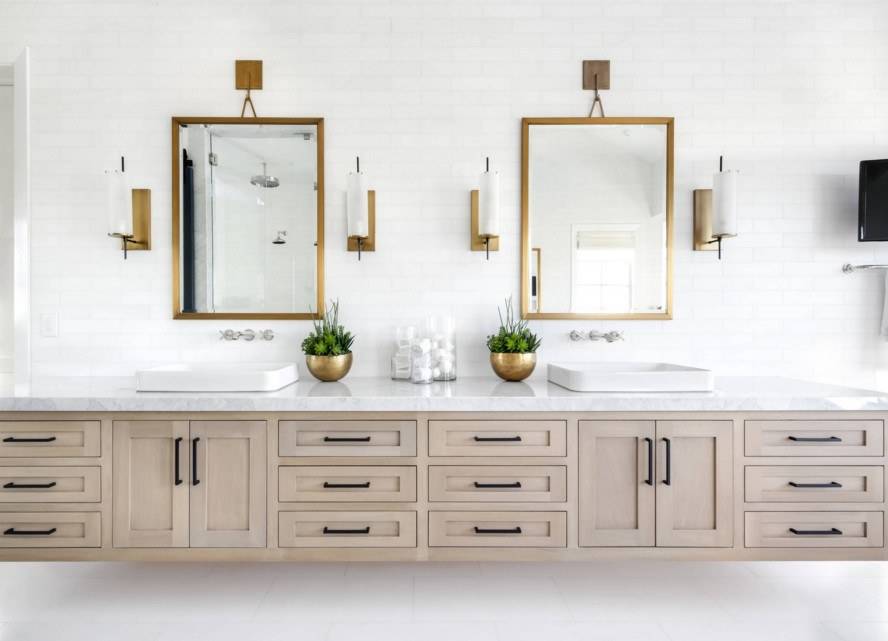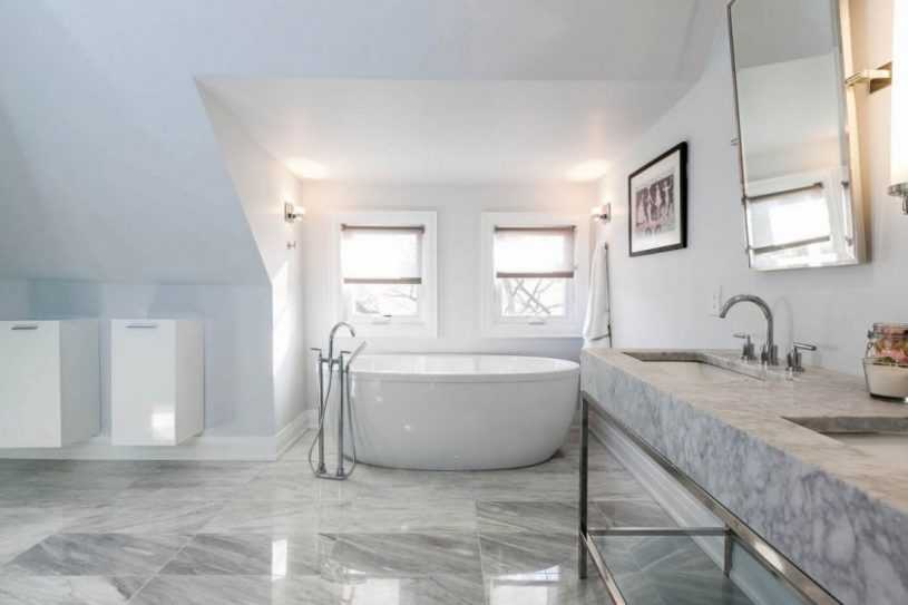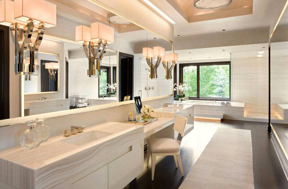 Отличное сочетание зеркал, мрамора и белых поверхностей создаёт ощущение простора и обилия света
