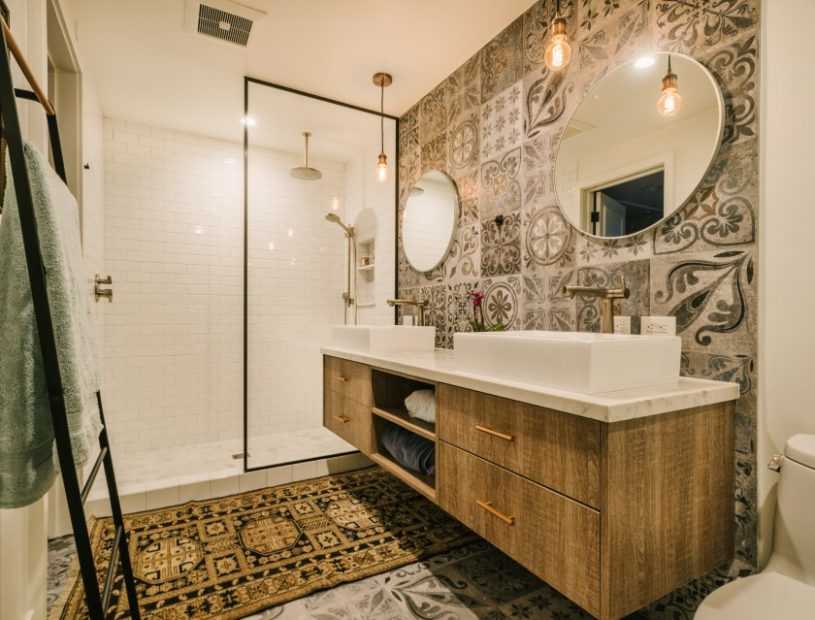 Песочные часы на фото выше, и уникальный внешний вид каждой плитки являются простой и в то же время чрезвычайно элегантной основой для декора современной большой ванной комнаты.