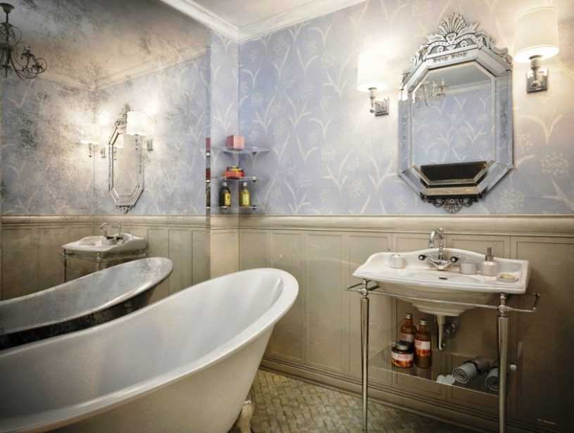 Саму емкость ванной устанавливают на ножки, подбирается модель с плавными формами. Если предпочтение отдается душевым кабинам, выбирают модели, имеющие матовые стенки. Оформление раковины должно походить на антиквариат, часто применяются эксклюзивные кованые элементы. Все сантехнические устройства можно расписать неяркими замысловатыми узорами. Осветительные приборы располагают только на потолке.