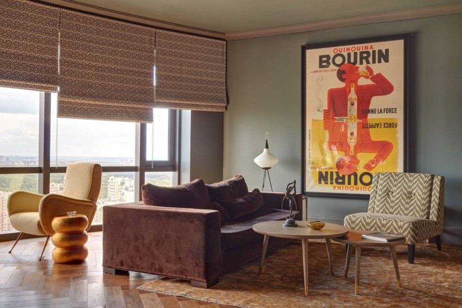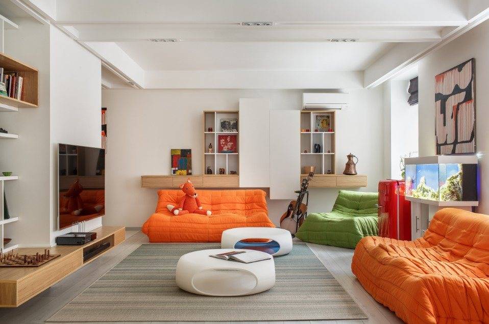 Среди ярких цветов стоит также остановиться на оливково-зелёном, шалфейном, горчичном, терракотовом цветах, каждый из них будет смотреться в интерьере очень свежо и оригинально. Ну а для солнечных помещений можно выбрать хит сезона — апельсиновый цвет.