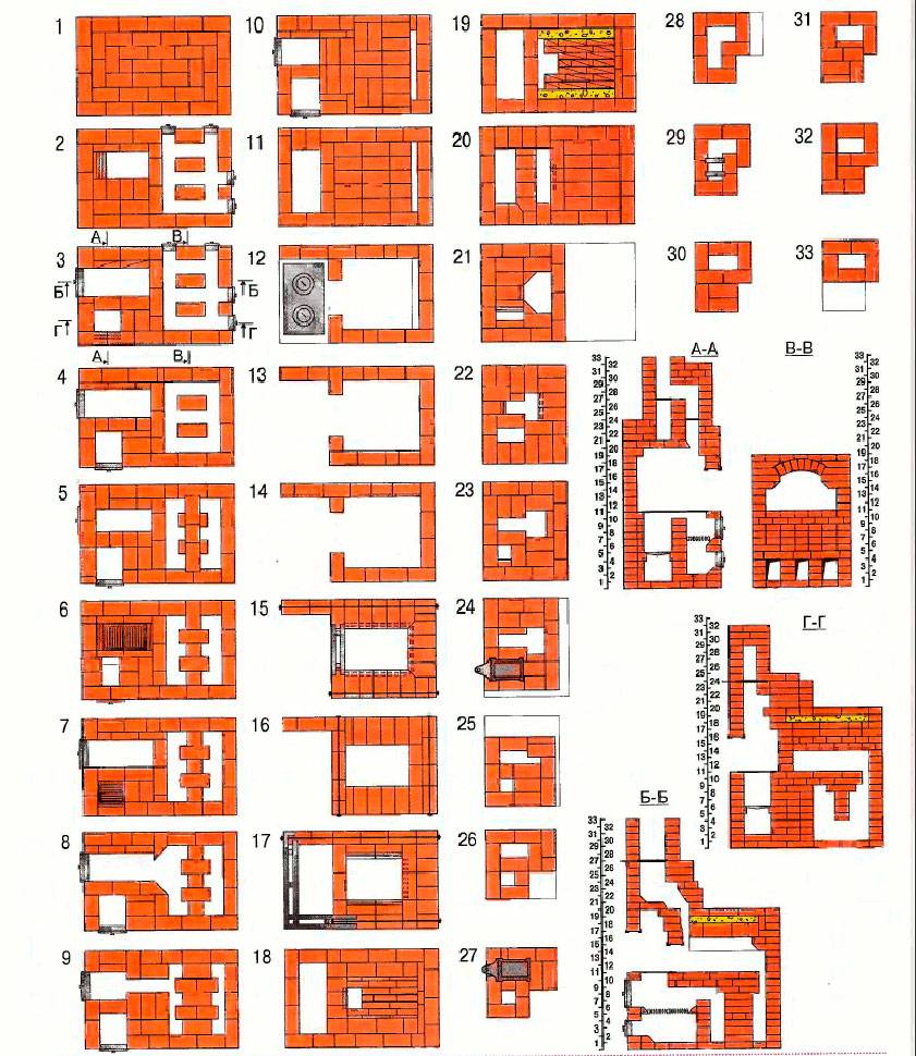 - со 2-го по 5-й – кладут поддувала обоих топливников и устанавливают их дверцы;