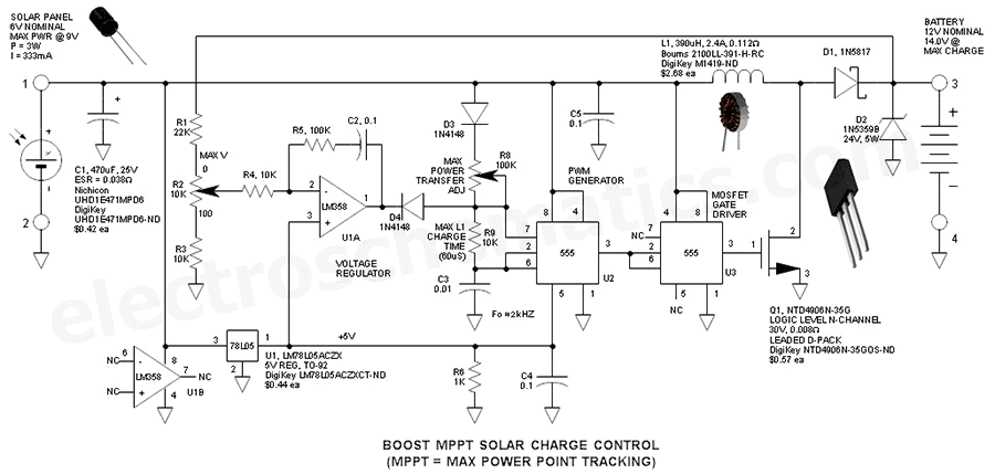 Но подобное устройство можно собрать и самостоятельно при наличии соответствующих навыков в радиоэлектронике. Ниже приведена простая схема повышающего контроллера, способного обеспечивать заряд аккумулятора от шестивольтовой солнечной батареи: