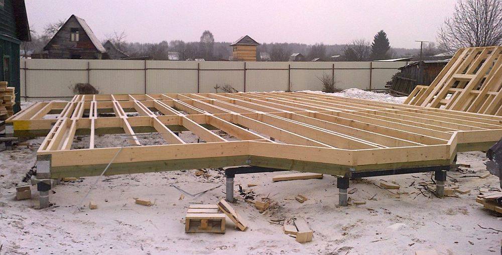 Поскольку технология сборки каркасного дома предусматривает создание жесткой коробки, процесс сборки стен тесно связан с постройкой чернового пола. К строительству мы приступаем сразу после затвердевания фундамента.