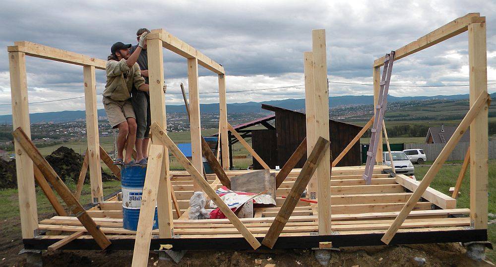 Обратите внимание! Если вы выбираете метод вырубки, то длину стоек, соответствующую высоте будущих стен, нужно увеличить на высоту двух пазов. Шаг стоек во многом зависит от заранее выбранного материала стен