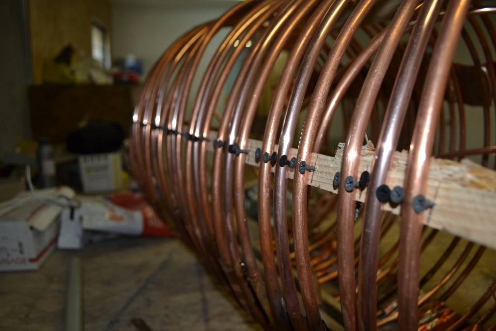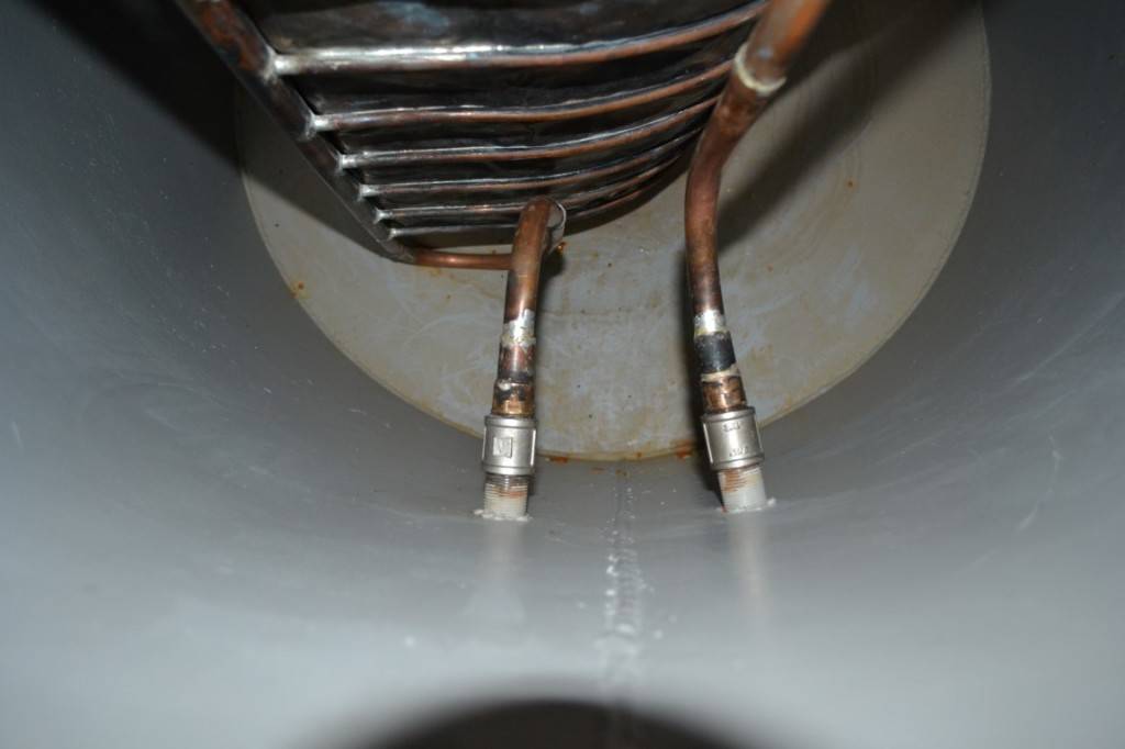 - Змеевик (теплообменник) – это главная деталь всего устройства, так как нагрев происходит именно с его помощью. Идеальным вариантом станет медный змеевик большого диаметра (около 20 мм), так как медь не будет ржаветь, в отличие от стальной или оцинкованной трубы.