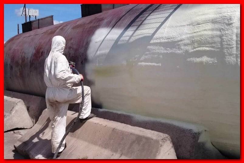 Установка для нанесения имеет другую конструкцию, размер ячеек получается существенно меньше, чем у жидкого пенополиуретана. Это отличие обеспечивает большую жесткость покрытия, его наносят в несколько слоев. Каждый слой не имеет швов или стыков, при этом обеспечивается полная герметичность и защита материала утепленного резервуара от коррозии.