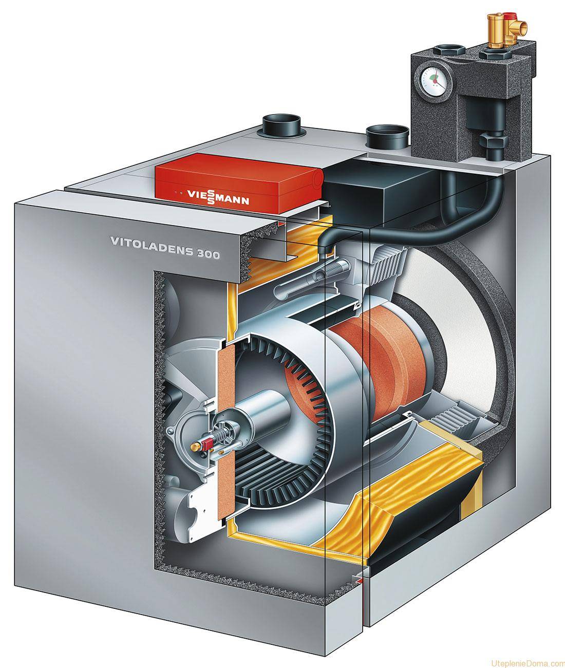 Первичный теплообменник — это изогнутая труба большого диаметра с медными пластинами. Поверхность устройства покрывается антикоррозийной краской.