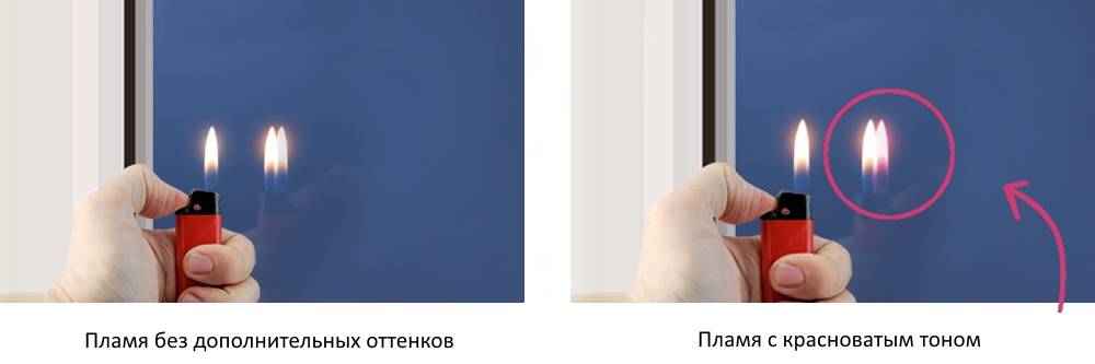 Внешний вид энергосберегающей продукции не отличается от обычных окон, поэтому покупателя довольно легко обмануть. Единственный подручный способ избежать обмана – внимательно посмотреть на отражение. Лучше всего использовать спичку или зажигалку, который подносятся к стеклу. Необходимо смотреть на цвет огня, который отражается во втором стекле. Если цвет отличается от оригинального, значит, камера внутри наполнена газом. Он изменяет пропускающие свойства, что и меняет цвет пламени в отражении.