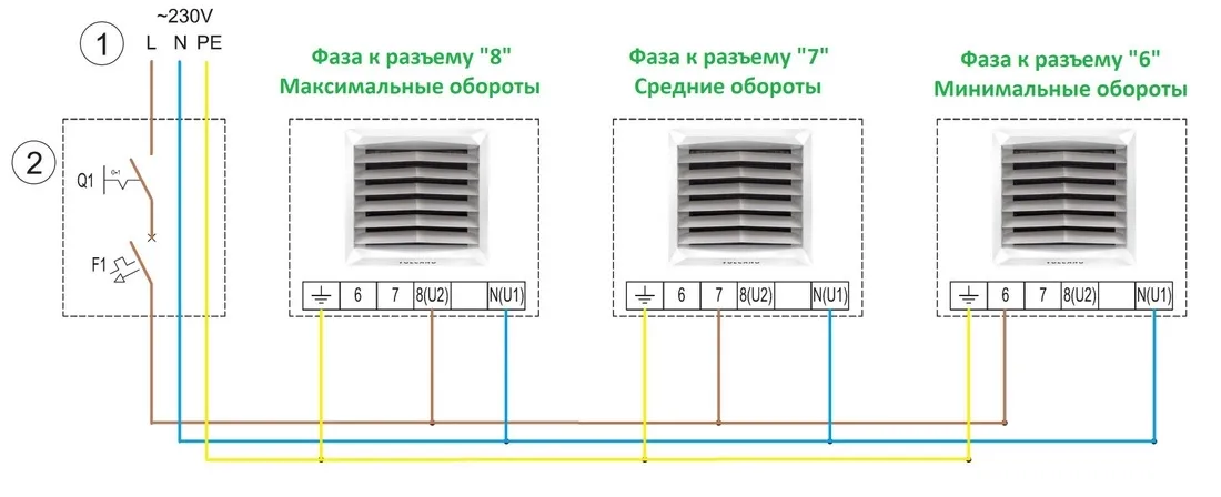 В зависимости от того куда подключить питающий провод фазы, будет зависеть выбор скорости вращения электродвигателя и его производительность в м3/час (расход воздуха):