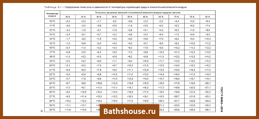 В интернете и специальной литературе публикуются таблицы со значениями точки образования росы для воздуха с разными параметрами.