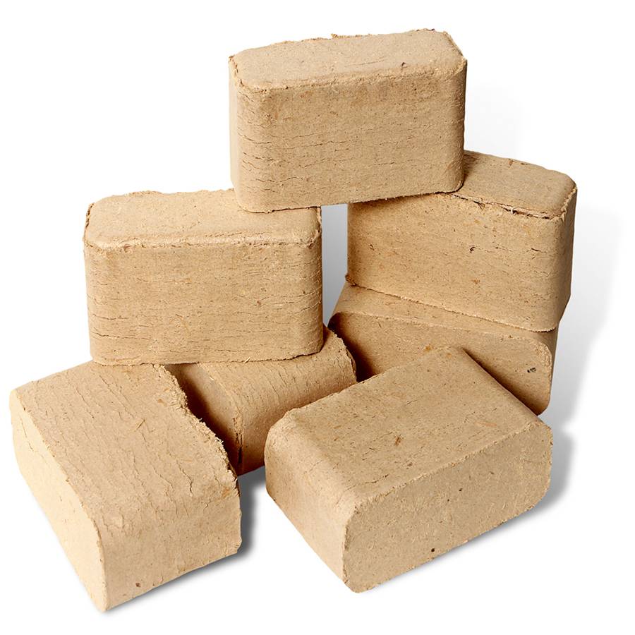 - Изделия низкой плотности — 0.8 г/см3. Это квадраты или прямоугольники, сделаны из наименьших частиц материала. Отличаются высокой теплопроводностью и длительным горением. Удобны в хранении, транспортировке, не занимают много места.