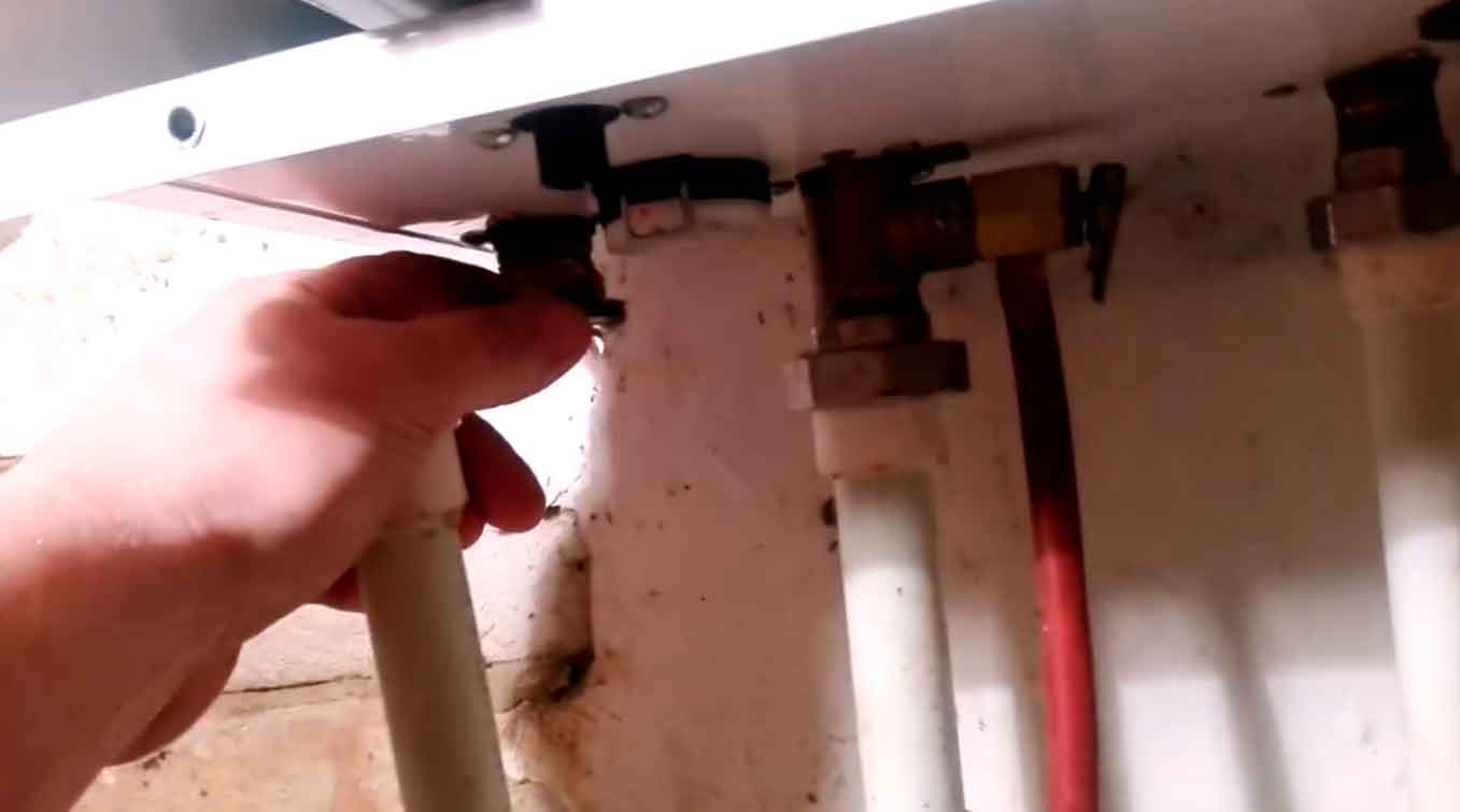 Нужно снять фильтр, отстегнув фиксирующую шпонку и потянув его вниз. И отсюда стекают остатки воды.