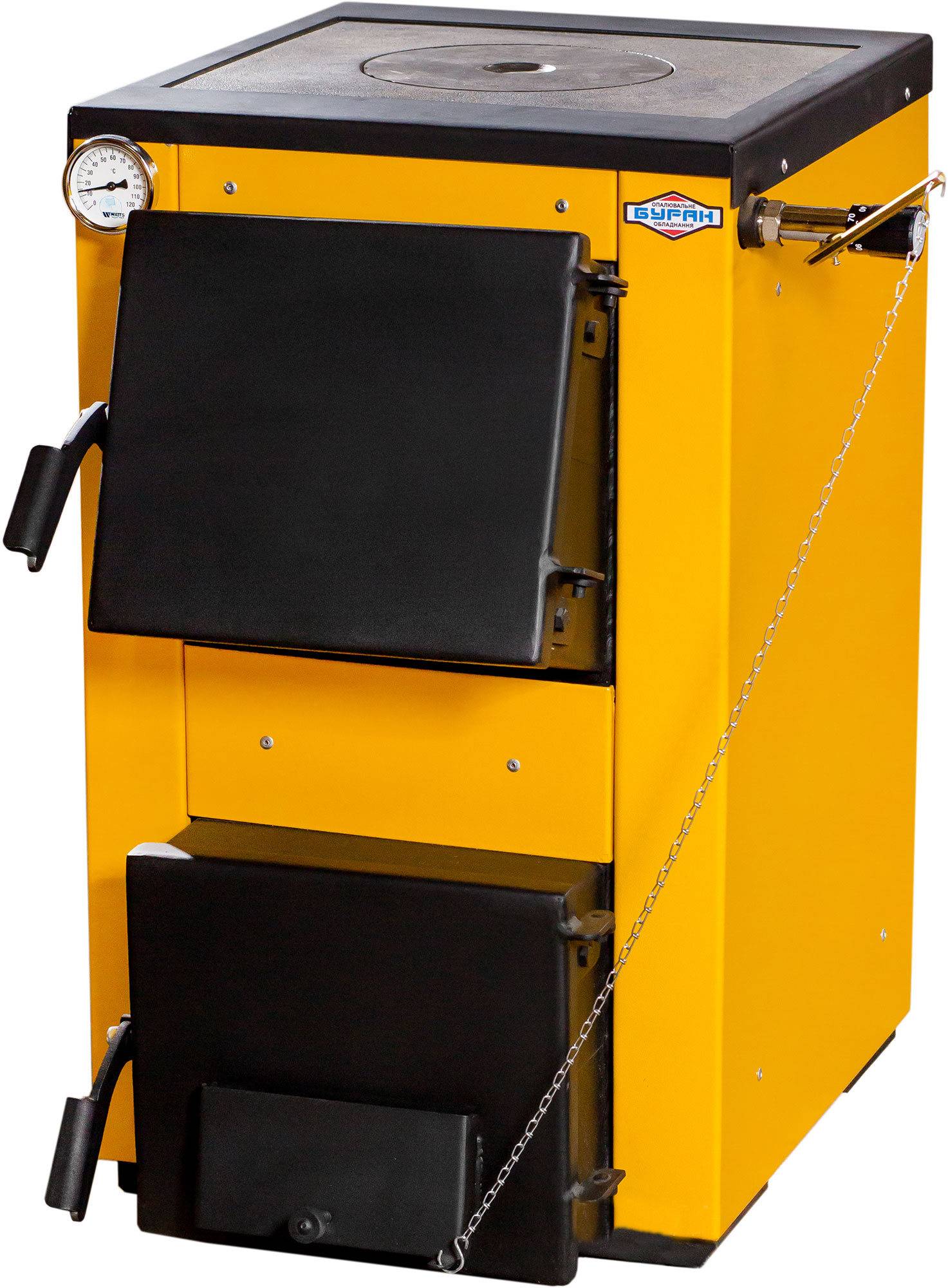 Котел отопления на твердом топливе длительного горения российского производства, изготовлен из огнеупорной стали. Оснащен трехходовым теплообменником, водяной рубашкой и тремя вертикальными камерами. Управление заслонкой выполняется в автоматическом режиме. Аппарат способен отдавать тепло на протяжении 8-12 часов, с момента заполнения топочной камеры. Топка обделана огнеупорным шамотом – это также сказывается объемах выделяемой энергии. Способен прогреть помещение до 100 квадратов.