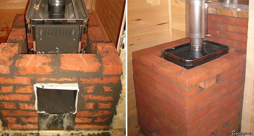 Если каменка не имеет конвекции, весьма распространена практика ее полной обкладки кирпичом. Для этого демонтируется отражающий экран или тонкий хромированный корпус, эти детали могут использоваться в разделке перекрытия под дымоход. Все, что остается — топка и каркас с контейнером для камней — обкладывается сперва в половину шамотного кирпича на чистой шамотной глине, а затем в четверть красного глиняного кирпича на цементном растворе. Верхний наружный ряд выкладывается в полкирпича с подворотом вовнутрь. При таком устройстве увеличивается инерция нагрева: парилка будет протапливаться чуть дольше, но температура при разной интенсивности горения станет примерно одинаковой.