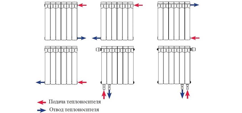 Прежде всего, мощность радиатора определяется количеством секций. Как мы уже знаем, некоторые типы позволяют их добавлять и снимать. Сама батарея работает простым образом: жидкость (чаще всего вода) начинает свой путь в одном месте, нагревается, протекает всю конструкцию и выходит в другом конце. Где находится начало и конец выясняется манерой подключения.