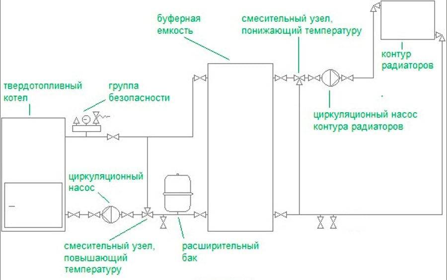 Основные достоинства такой схемы отопления в том, что при остановке котла данная система еще некоторое время будет снабжать радиаторы горячим теплоносителем. Правильный подбор буферной емкости для твердотопливного котла позволяет значительно увеличить время между топками котла, уменьшить расход топлива и сэкономить средства. Кроме этого, использование этого устройства позволит сгладить температурные колебания в котловом и отопительном контуре.