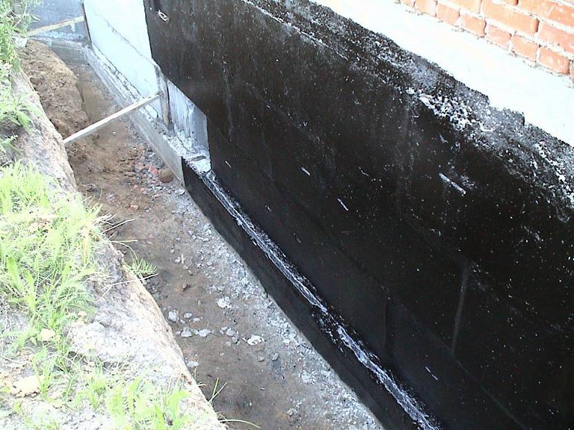1. После того как полностью отлит фундамент (либо сделан из блоков бетона), на наружную поверхность наносится слой гидроизоляции. В качестве нее используют смолы на основе битума или иные аналогичные стройматериалы. Иногда же применяют листовую гидроизоляцию, которая фиксируется на специальный слой клейкой или вязкой гидроизоляции.