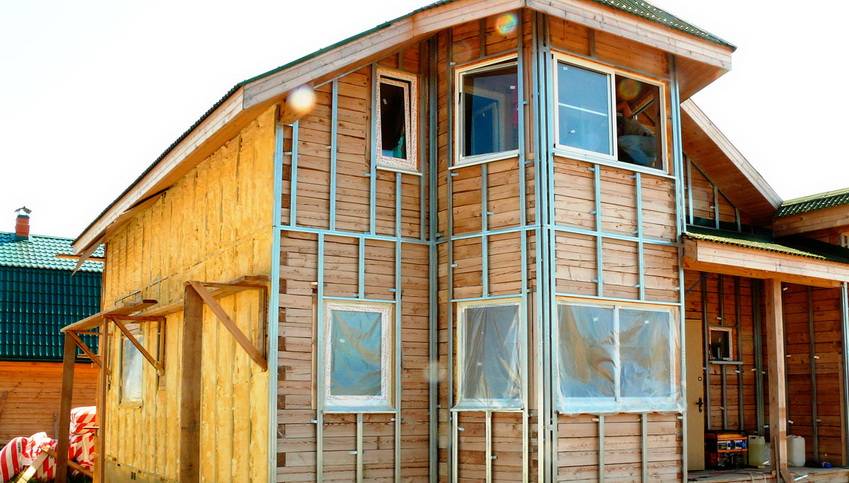 К деревянному каркасу прибивают рейки толщиной 5 см. Их задача – создать вентиляционный зазор, который не позволит влаге скапливаться. И уже к самим рейкам крепится отделочный материал.