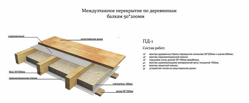 Деревянные межэтажные перекрытия – наиболее часто встречающийся вариант в индивидуальном домостроении. Их конструкция одинакова и в деревянном, и в газобетонном доме. Она представляет собой плоскость с ребрами жесткости, между которыми и укладывают материал, используемый для утепления. Схема перекрытия дома представлена на рисунке ниже.