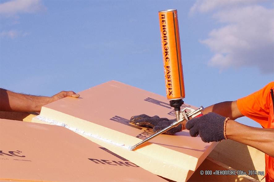 Поверх гидроизоляции крепят пенопластовые плиты с помощью специального клея. После нанесения клеящего состава на утеплитель следует 1 — 2 минуты подождать и плотно прижать его к потолку. Плиты монтируются встык. При наличии зазоров между теплоизоляционными изделиями их герметизируют монтажной пеной. Лучше дополнительно зафиксировать утеплитель на поверхности с помощью саморезов с шайбами большого диметра (10-14 мм.).