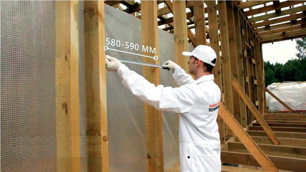 Стандартный утеплитель минеральной ваты имеет ширину 600 мм. Поэтому при возведении каркаса этот момент необходимо обязательно учитывать. Чтобы материал плотно прилегал к вертикальным стойкам, идеальным размером шага между ними является 580-590 мм. Такое расстояние не позволит со временем утеплителю сползти вниз, так как он будет плотно зажат.