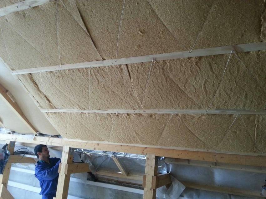 - Работа выполняется в процессе сборки крыши, чтобы было легче плотно уложить утеплитель на потолок.