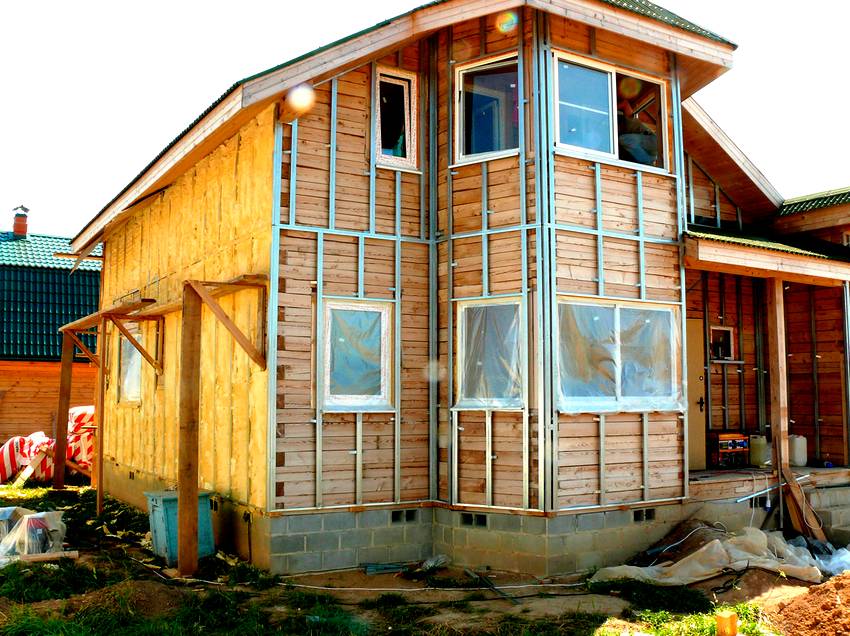 Это наиболее распространенный вариант утепления фасада деревянного дома. При этом слой утеплителя крепится на стены, а поверх него выполняются облицовочные декоративные работы. Между отделочным слоем и утеплителем требуется обязательно оставлять зазор для осуществления вентиляции. Эта технология помогает не допустить сырости, парообразования, гниения дерева.