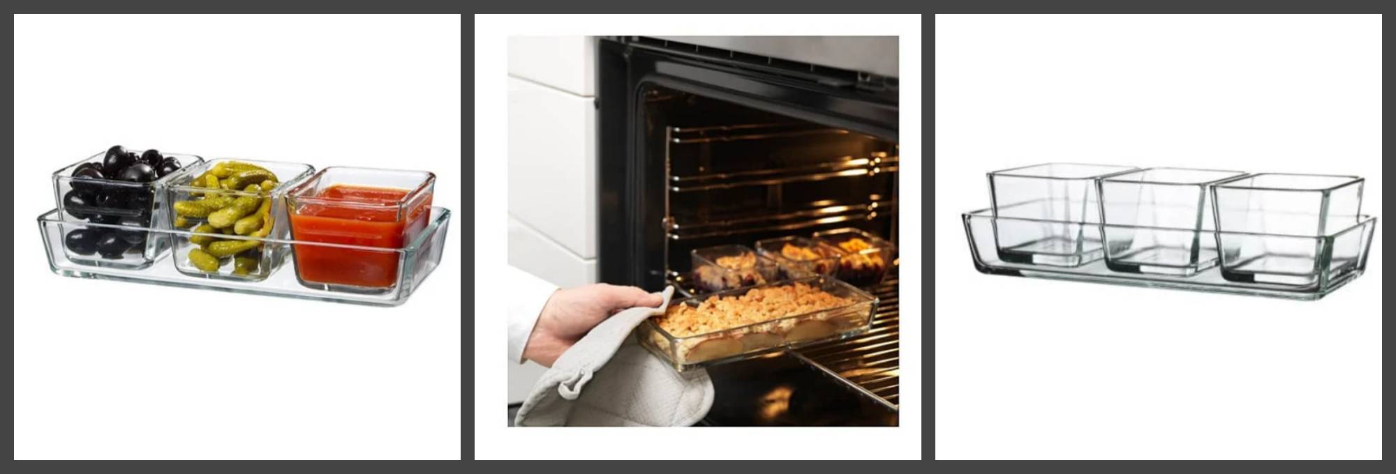Чем лучше обычного противня: тем, что после духовки или микроволновки можно ставить прямо на стол, так как стекло выглядит красиво и, в принципе, не требует того, чтобы перекладывать еду на сервировочную тарелку. В Икеа большой выбор разных стеклянных форм, на 500 рублей можно накупить даже набор из 2-3 больших форм одной серии. Я же хочу порекомендовать “Микстур” за 299. Он хорош для маленьких порционных десертов, но “подставка” снизу тоже достаточно глубокая, чтобы в ней что-то запекать. Особенно такой подарок оценят те, у кого не стандартная большая духовка, а маленький духовой шкаф или кто использует микроволновую печь с конвекцией. В остальное время их можно использовать для сервировки всяких закусок.