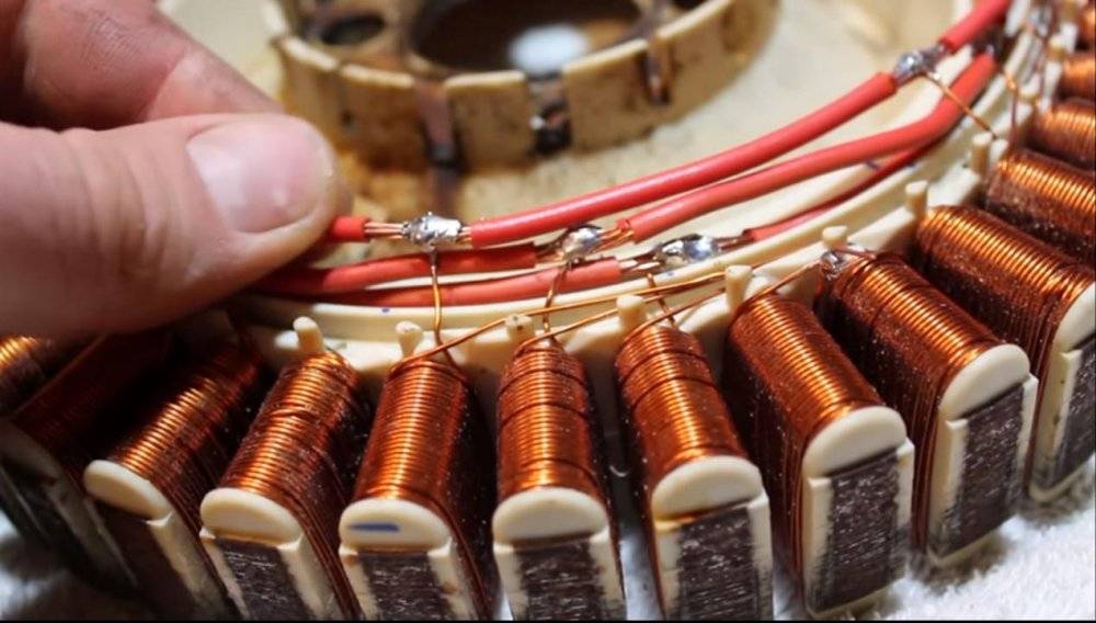 Ставят ротор и статор и на дистанции 2 мм. Обмотки объединяют таким образом, чтобы получился 1-фазный источник переменного тока.