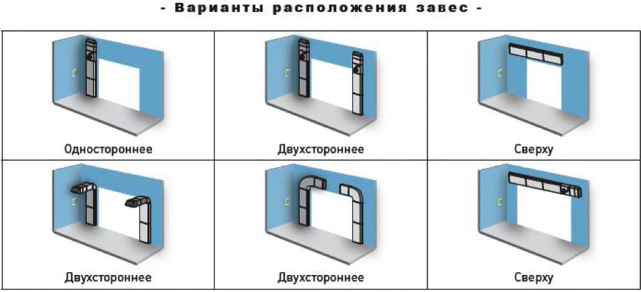 При разделении двух помещений возможны варианты установки. Завеса обязательно должна перекрывать всю площадь дверей. Перед выбором мощности изделия нужно предварительно обследовать характеристики помещения и устранить имеющийся дисбаланс вентиляционных систем.