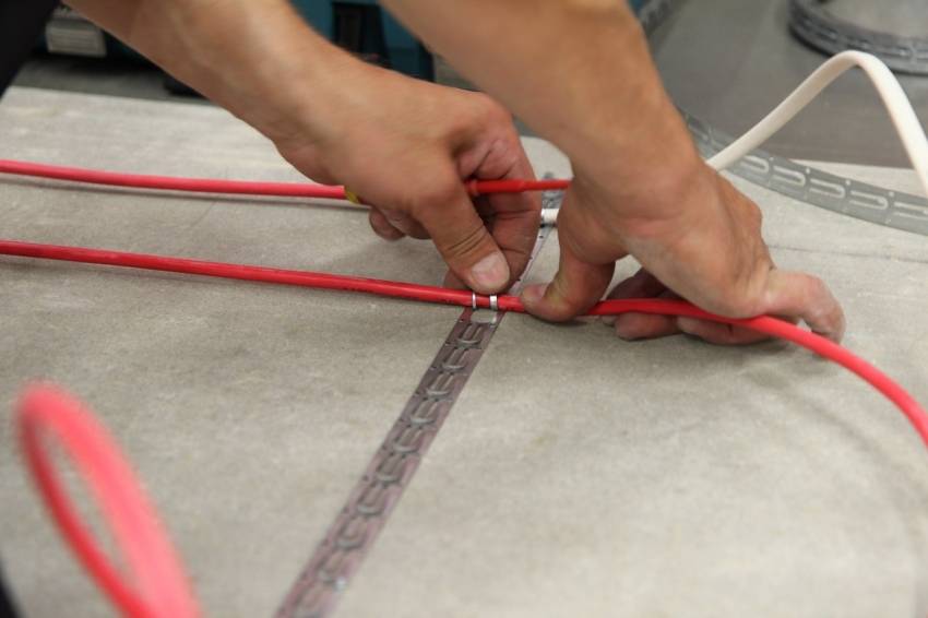 В этом случае в качестве нагревательного элемента используют специальный электрический кабель, который змейкой прокладывается на поверхности основания. При этом обязательно соблюдают определённый шаг и выполняют фиксацию при помощи лепестков монтажной ленты. Все это, включая гофротрубку и термодатчик, заливают бетонной стяжкой, толщина которой составляет 3-5 см.