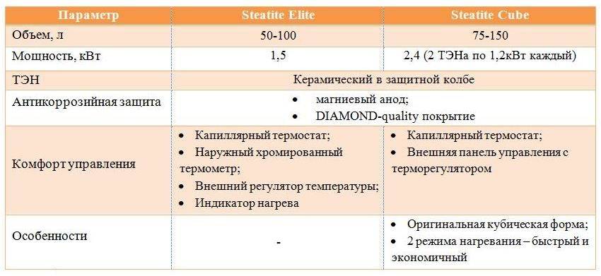 По типу нагревательного элемента компания предоставляет потребителю водонагреватели с «сухим» ТЭНом, заключенным в керамическую колбу, и погружным.