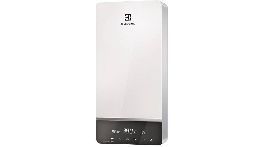 Небольшая горизонтальная модель (191x141x95 мм) с верхним подключением. Предназначена для закрепления на стене. Нагрев происходит спиральным элементом. Производительность 2,8 л/мин. Мощность 6 кВт. Можно подключать к нескольким смесителям (напорный). О включении прибора и о выполнении нагрева сообщает световой индикатор. Оснащен термометром и дисплеем. Управляется электронным способом. При достижении заданных параметров, отключается. Выключается при перегреве и при включении без воды. Выдерживает до 7 атм. Цена: 7600 рублей.