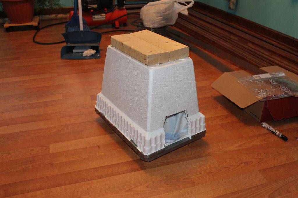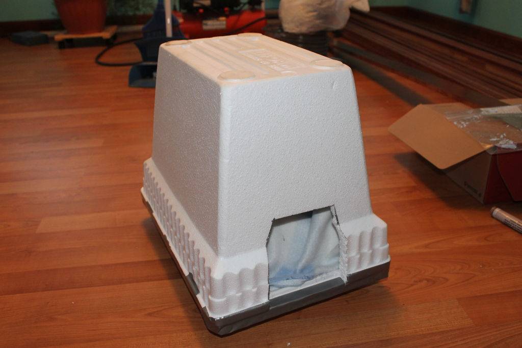 Если под руками есть какая-либо ненужная пластиковая емкость, вполне возможно устроить домик в ней, предусмотрев утепление изнутри, как показано на фото.