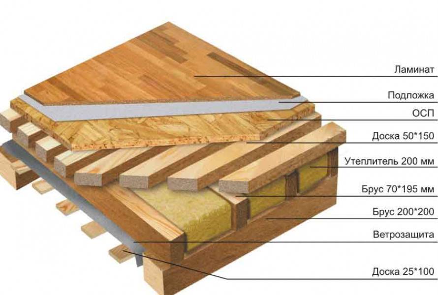 Помните, что между слоем теплоизоляции и чистовым полом необходимо выдержать расстояние, достаточное для того, чтобы обеспечить свободную циркуляцию воздуха и отведение паров из утеплителя. Если финишное напольное покрытие уложить вплотную к теплоизоляционному слою, то древесина пола может со временем загнить или заразиться грибками и плесенью.